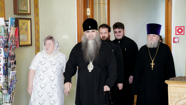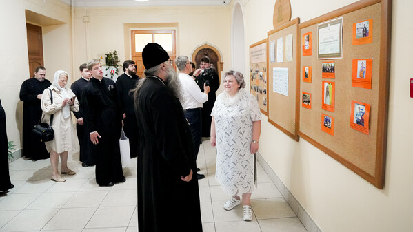 Митрополита Георгия приветствовали директор гимназии Елена Николаевна Мошкина и настоятель храма в честь святой великомученицы Екатерины протоиерей Сергий Гомаюнов. Елена Николаевна и отец Сергий рассказали митрополиту Георгию об истории гимназии и Екатерининского храма: Вятская православная гимназия находится в здании бывшей Вятской Мариинской женской гимназии, Екатерининская церковь построена в 1898 году по проекту архитектора Ивана Аполлоновича Чарушина.
