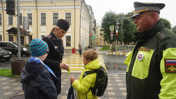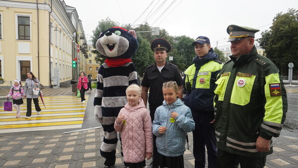 Вместе с сотрудниками ГИБДД пеших участников дорожного движения встречали четвероклассник Николай Потапов из гимназического отрада Юных Инспекторов Движения и Кот Матроскин (в ростовую куклу нарядили Леву Селивановского) — ребята помогали взрослым объяснять правила дорожного движения и раздавать светоотражающие элементы.