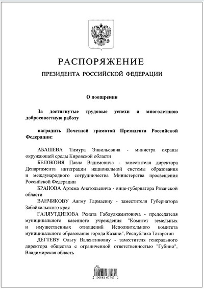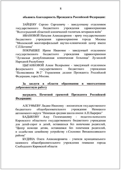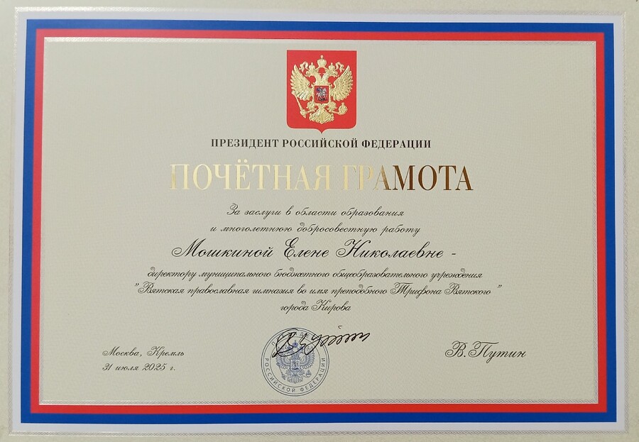 У гимназии — замечательная новость! Директору Вятской православной гимназии Елене Николаевне Мошкиной за заслуги в области образования и многолетнюю добросовестную работу вручена Почетная грамота Президента Российской Федерации.