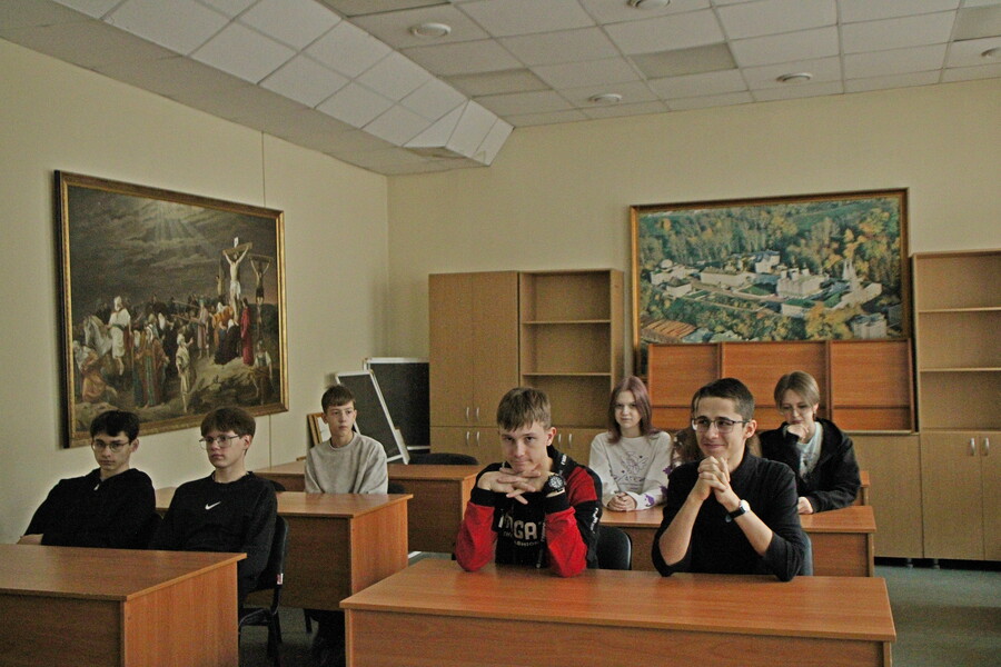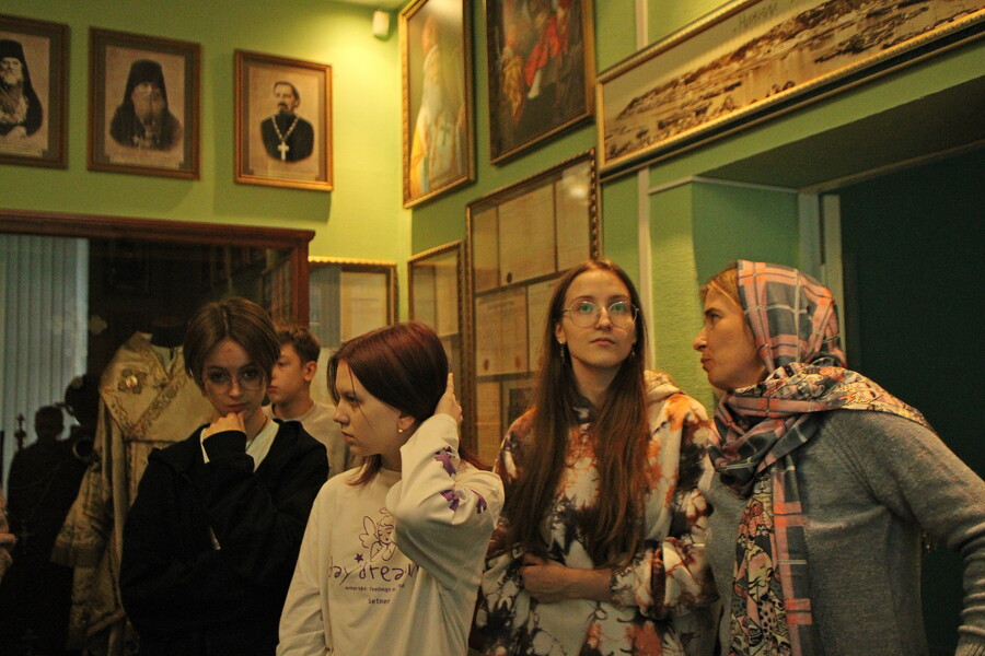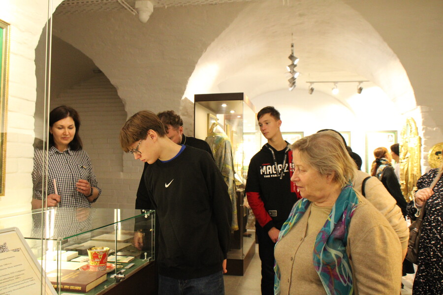 Следующим пунктом стала Нижегородская духовная семинария. Знакомство с ней началось с экскурсии по Благовещенскому мужскому монастырю, прямо за стеной которого расположен учебный семинарский корпус. Мы побывали в студенческом домовом храме, освященном в честь святителя Алексия Московского, прошли по территории монастыря, познакомились с Благовещенским собором, в котором пребывает особо почитаемая икона Божией Матери «Корсунская». В самом здании семинарии мы побывали в учебных классах, услышали о том, какие предметы изучают студенты. Небольшой, но очень уютный музей семинарии дал нам представление о людях, создававших ее. Центральное место на стене против входа в него занимает древний огромный Животворящий Крест Господень, который планировалось как ценную реликвию вывезти за границу, но таможенники не пропустли святыню на границе. Там же в витринах мы увидели антиминсы дореволюционных храмов Нижнего Новгорода.