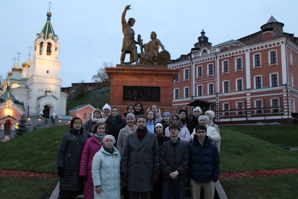 На главной площади Нижнего Новгорода — площади Кузьмы Минина и Димитрия Пожарского — наша группа сделала снимок на память об этой замечательной поездке, которая оставила неизгладимы след в наших душах благодаря гостеприимству, радушию принимавших нас нижегородцев, и конечно, тому неоценимому интеллектуальному и духовному наполнению, которым мы обогатились.