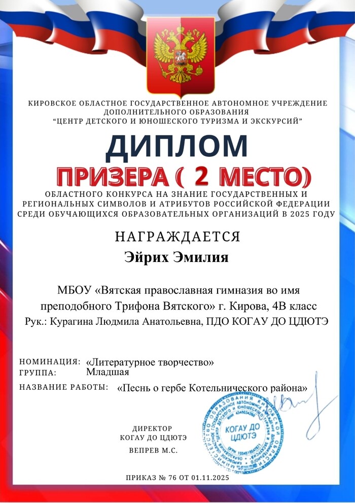 К празднику Дня народного единства, который символизирует неразрывную связь поколений, верность Отечеству и нашу общую ответственность за его будущее, были подведены итоги областного конкурса на знание государственных и региональных символов и атрибутов Российской Федерации среди обучающихся образовательных организаций. Конкурс был организован КОГАУ ДО «Центр детского и юношеского туризма и экскурсий».
