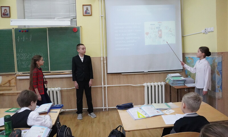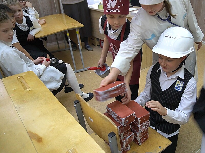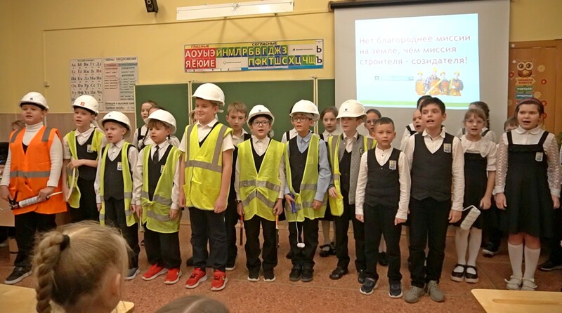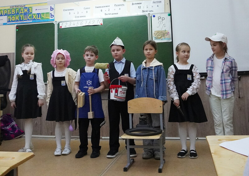 Каждый класс в параллелях со 2 по 4 классы в творческой форме представил какую-то профессию. Кто -то делал презентации о профессии повара, а заодно и рассказал об особенностях блюд русской кухни. Кто-то очень подробно и зрелищно представил профессию строителя. Кто-то ставил сценки и приготовил замечательный реквизит — инструменты, защитные средства (каски, рабочие костюмы, медицинские маски и даже кирпичи из папье-маше). Кто-то загадывал загадки и читал стихи. Получилось весело, задорно, познавательно.