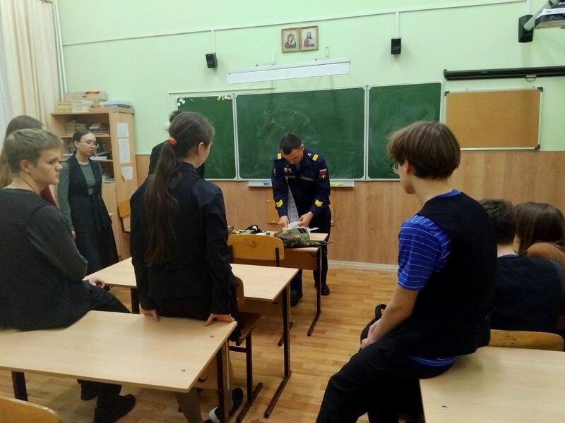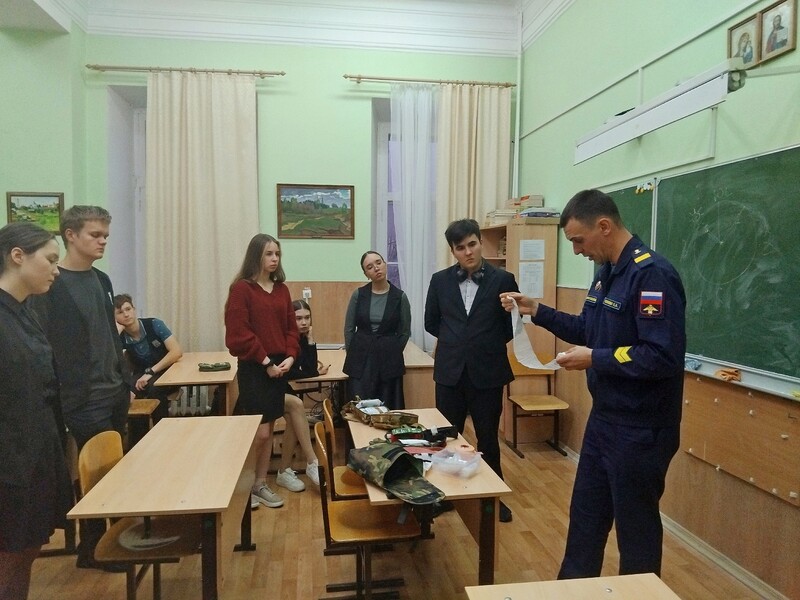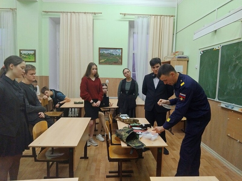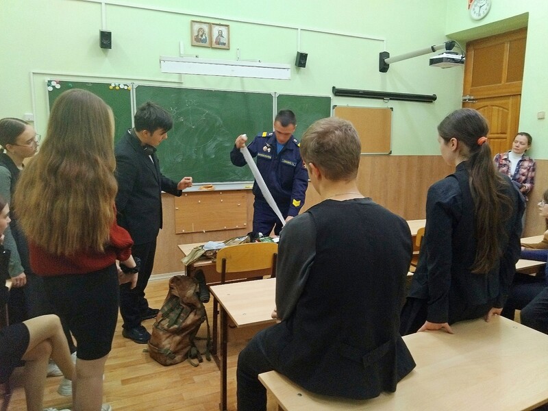 Нам показали на макете, как оказать первую помощь при глубоком артериальном ранении, как правильно остановить кровотечение и накладывать бинты. В конце мероприятия нам рассказали о военных зонах в СВО — красная, то есть самая опасная, где происходят основные боевые действия; желтая, в которой безопаснее, но возможны атаки дронов, осколочные удары, и самая безопасная — зеленая. После прослушанной теории и изученной практики мы задавали вопросы нашему гостю. Спасибо Павлу Андреевичу за этот интересный урок.